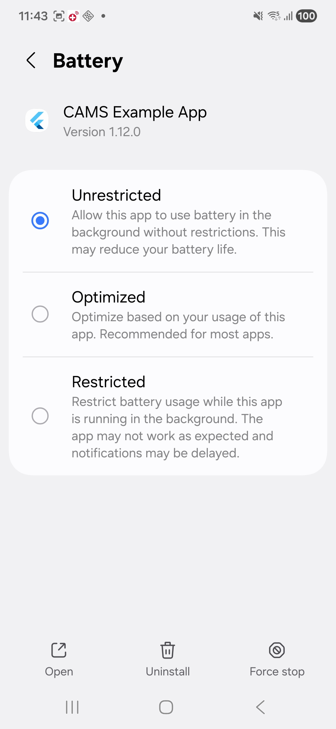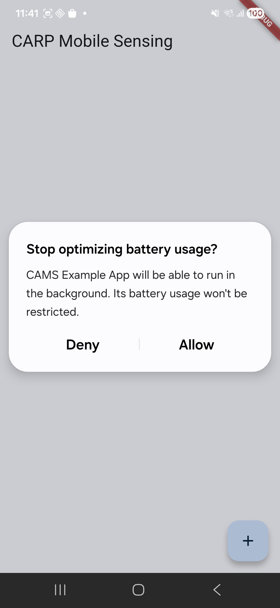 Starting from version 2.0, CAMS supports background sensing natively on Android using the flutter_background plugin. iOS does not allow apps to run in the background as such, but there are a few things you can do to optimize data sampling on iOS.Android